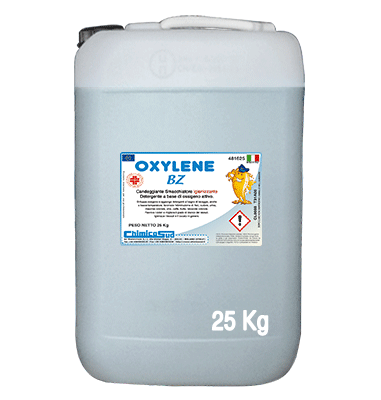 OXYLENE BZ: Candeggiante Smacchiatore Igienizzante Detergente a base di ossigeno attivo. Studiato principalmente per il lavaggio ad acqua nelle lavanderie "self-service", ottimo anche per il lavaggio ad acqua con lavatrici tradizionali, piccole o industriali. OXYLENE BZ sviluppa ossigeno e aggiunge detergenti al bagno di lavaggio, favorisce l'eliminazione di: feci, sudore, urina, macchie colorate come: Vino, Caffe, Frutta, Bevande colorate. Ravviva i colori e migliora il grado di bianco dei tessuti. OXYLENE BZ igienizza i tessuti e il bucato in genere. Confezionato in tanica plastica da 25 Kg.