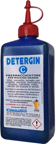DETERGIN-C: Presmacchiatore professionale per l'eliminazione delle seguenti macchie: olio, rossetto, smalto per unghie, vernici, inchiostro di penna e pennarello, grasso, asfalto, colla, lucido da scarpe e simili. DETERGIN-C può essere adoperato nel lavaggio a secco ed acqua, nella presmacchiatura. Si risciacqua facilmente in: Percloroetilene ed acqua. Presmacchiatura: inumidire la macchia con DETERGIN-C, strofinare delicatamente, tamponare con un rafforzatore (TERPURAN o DEOLAN) e lavare a secco. Confezionato in flacone in plastica da 420 ml.