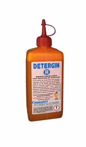 DETERGIN-R: Presmacchiatore professionale per macchie di ruggine, con azione delicata sulle fibre. Confezionato in flacone plastica da 420 ml.
