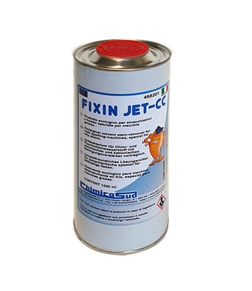 FIXIN JET-CC: Solvente speciale per macchie grasse per uso professionale, idoneo per smacchiatrici a freddo. Confezionato in contenitore metallico da 1 Litro.