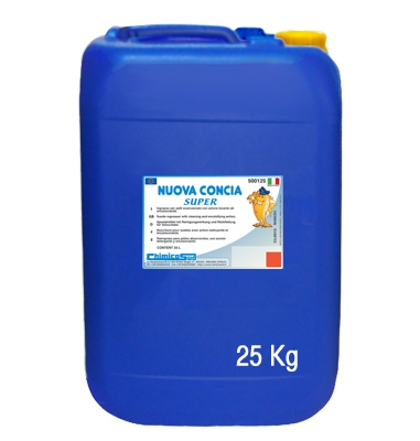 NUOVA CONCIA SUPER: è un ingrasso per pelli scamosciate con azione lavante ed emulsionante. Il prodotto ridona ai capi in pelle scamosciata la naturale morbidezza e brillantezza, rinnova la concia originaria dando voluminosità ("mano piena"), possiede un'ottima azione di rimozione dello sporco, migliora l'effetto di un eventuale trattamento idrofobo successivo. NUOVA CONCIA SUPER é appropriata per tutti i tipi di solventi clorurati e fluoroclorurati, macchine e sistemi di filtrazione. Confezionato in tanica plastica da 25 Litri.