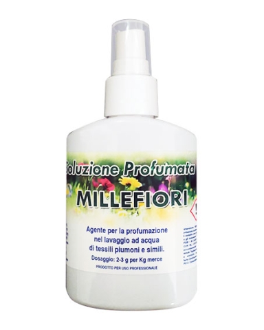 SOLUZIONE PROFUMATA PER LAVAGGIO AD ACQUA da utilizzare per profumare i tessuti, dopo l'asciugamento o prima del confezionamento.